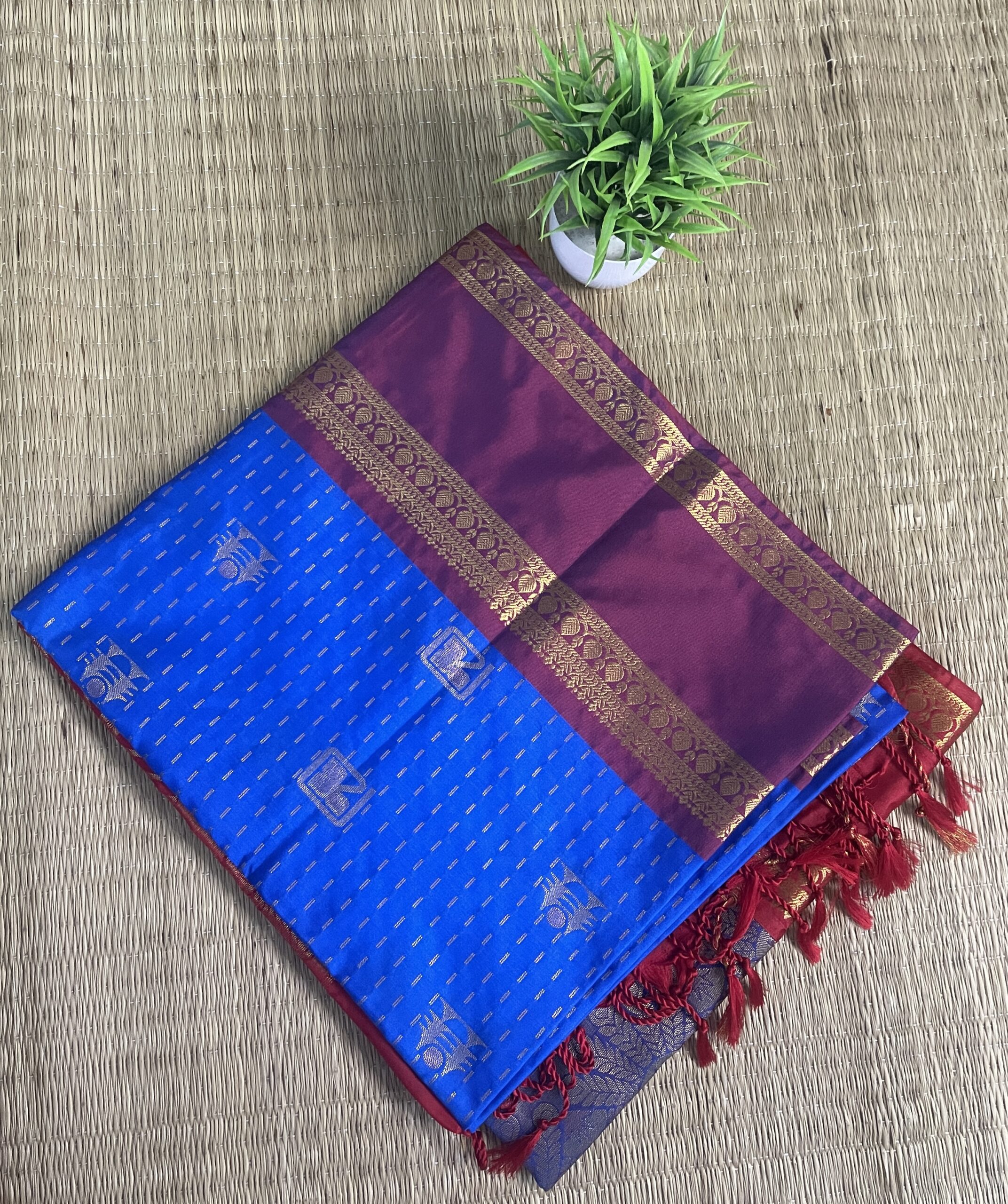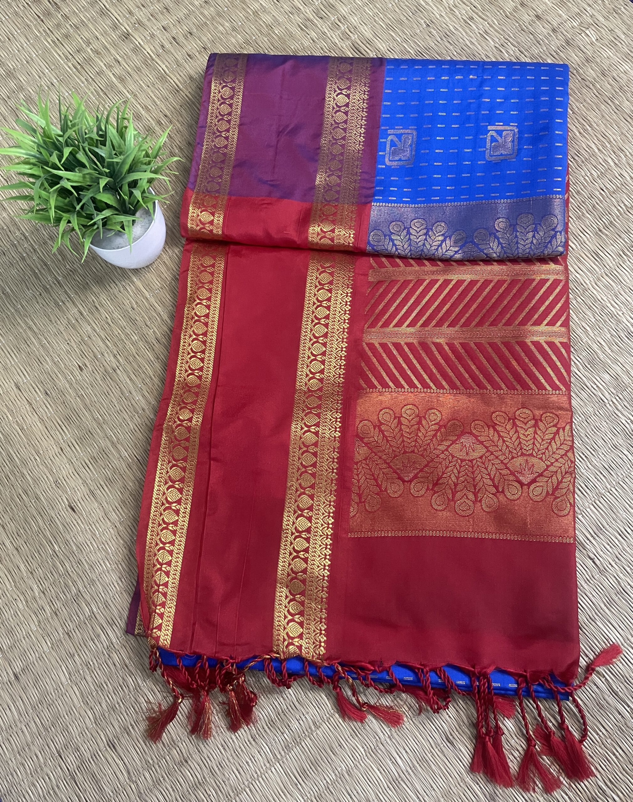 Made from premium soft silk, this saree offers a smooth texture and comfortable wear. The rich jacquard-woven contrast pallu elevates the overall elegance, while the matching contrast blouse completes the ensemble, making it a perfect choice for festive celebrations and traditional functions.