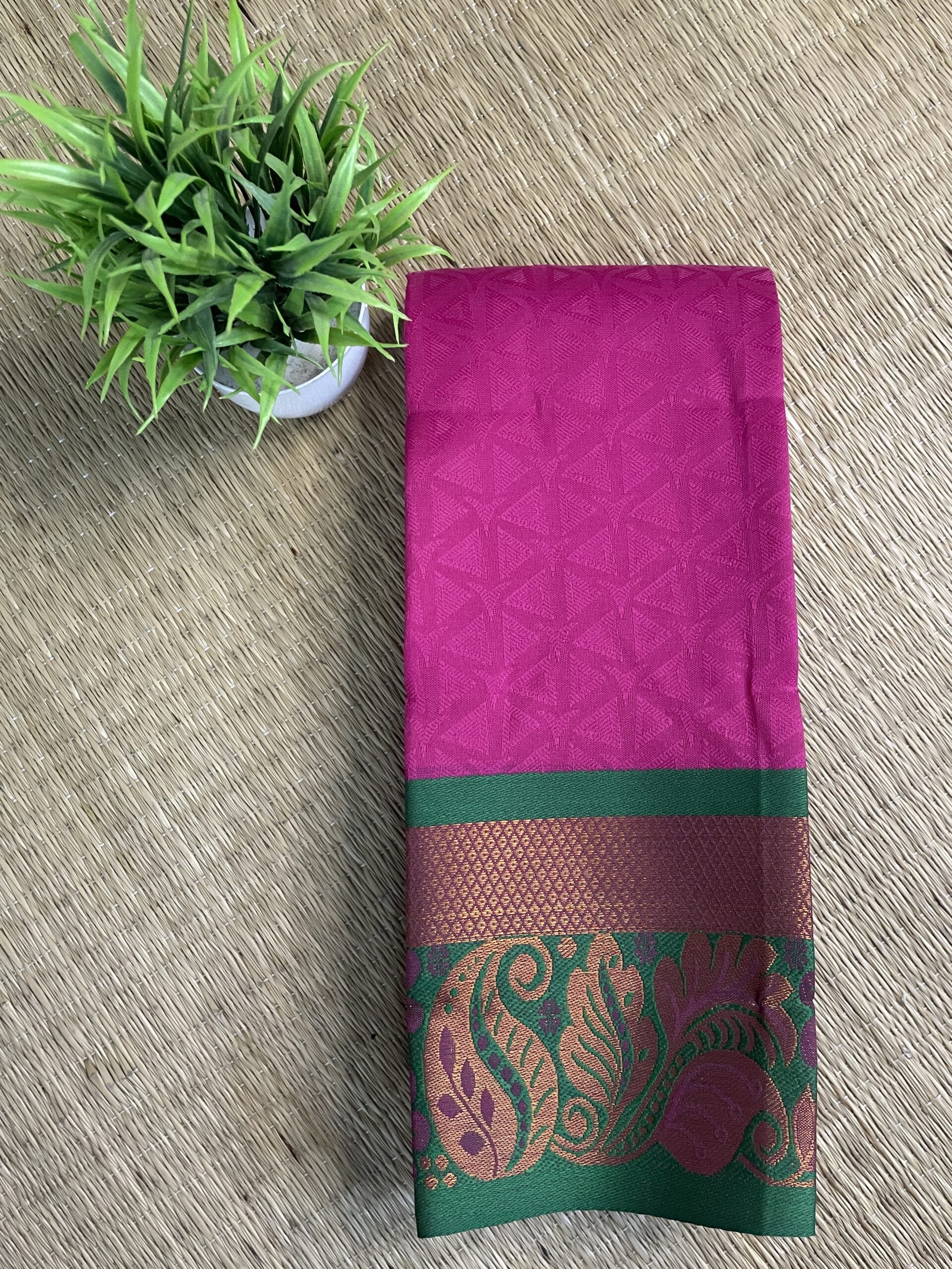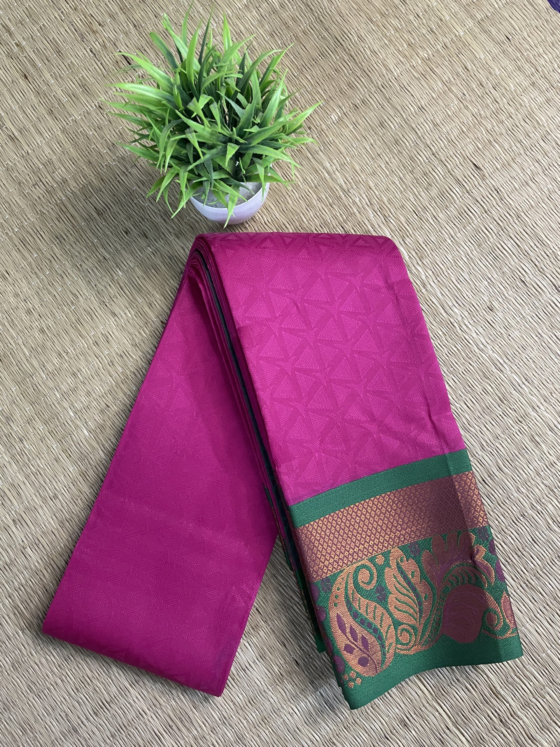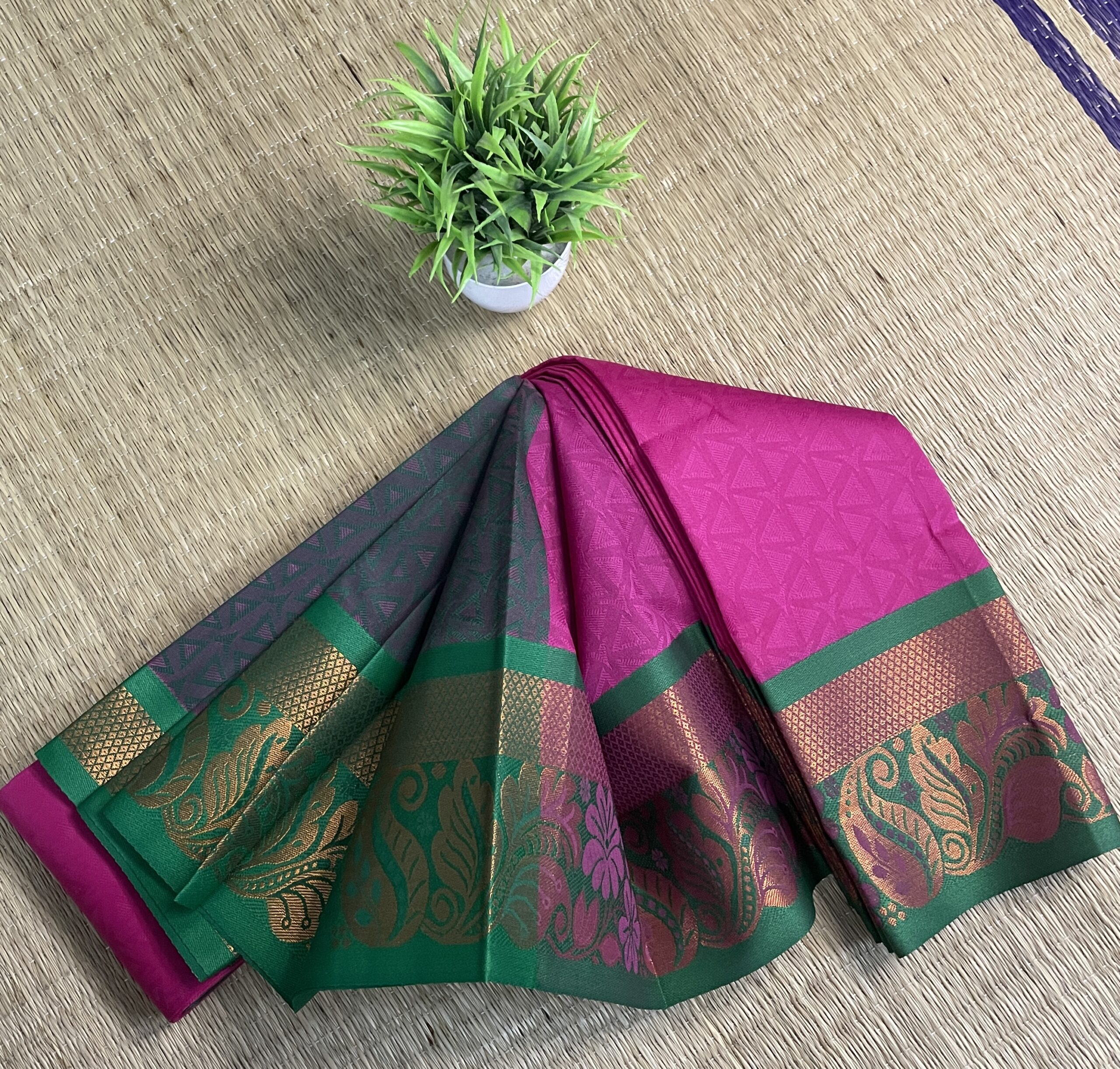 Crafted using Tana 50’s warp with 110 count, this saree offers a fancy soft texture and an effortless drape, ensuring comfort throughout the day. The rich pallu, combined with the elegant Meena border, makes this saree an ideal choice for festive occasions and special gatherings.